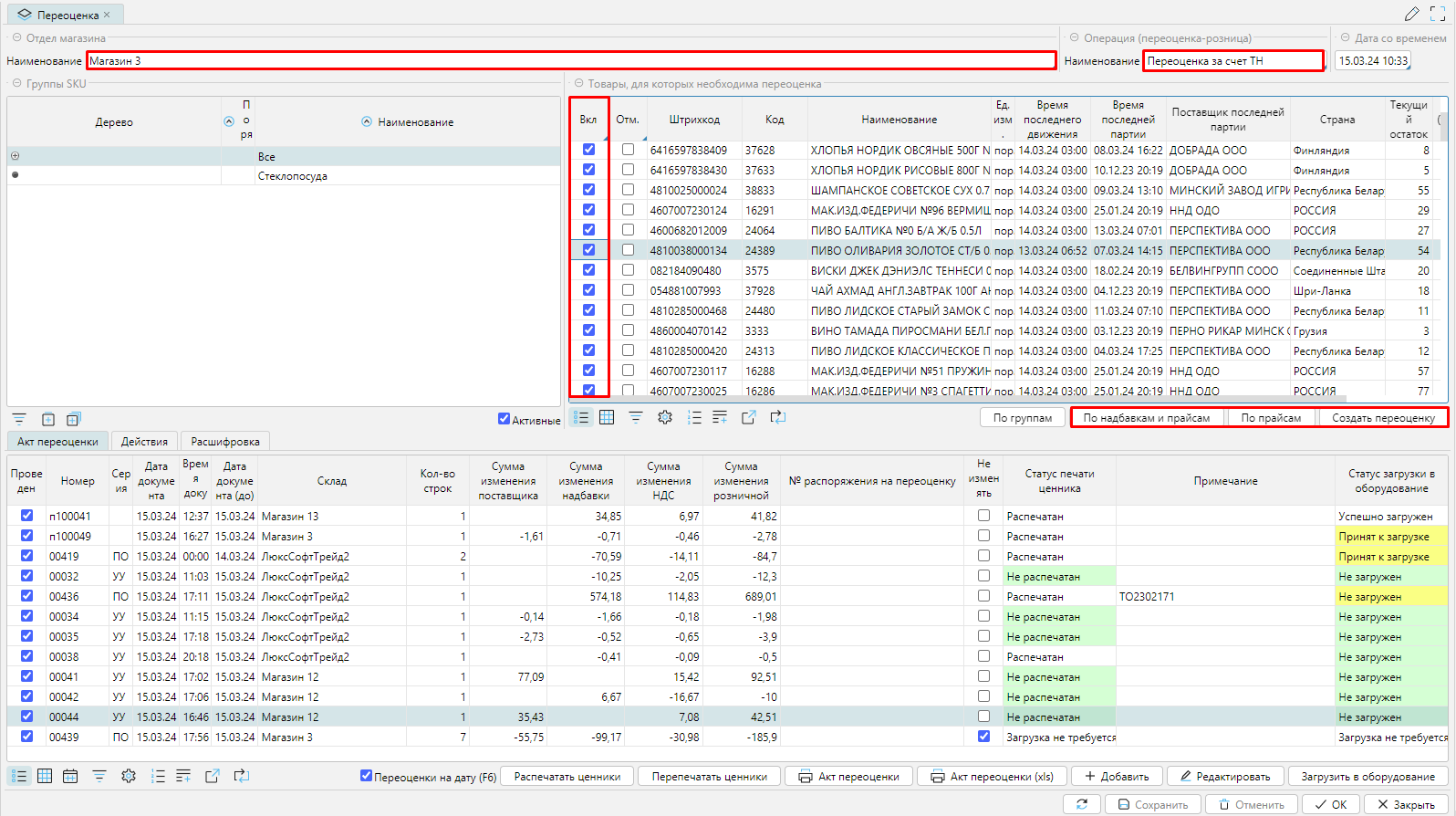 Для формирования необходимо выбрать магазин, соответствующую операцию в поле "Операция (переоценка-розница)", нажать кнопку "По Прайсам" или "По надбавкам и прайсам" для отбора списка товаров соответствующих условиям переоценки, а затем нажать кнопку "Создать переоценку":
