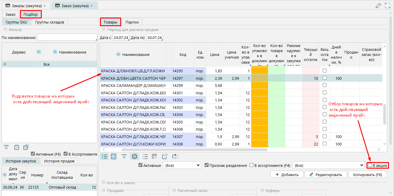 Автоматическая подсветка и фильтрация акционного товара по умолчанию есть в форме Закупки\Закупки\Заказы (вкладка "Подбор" при формировании заказа).