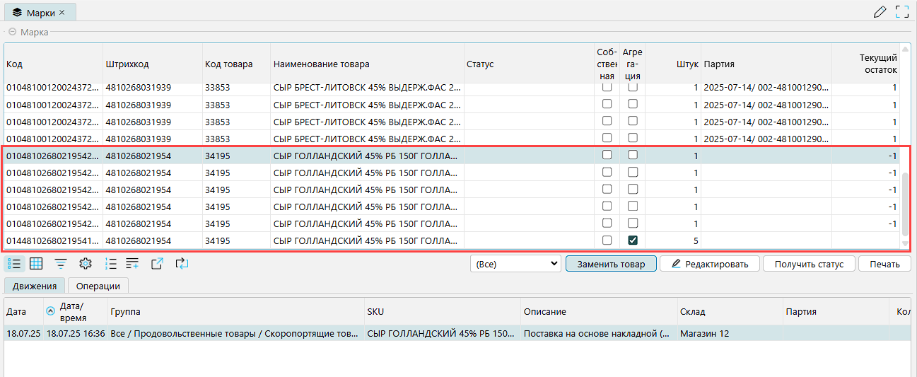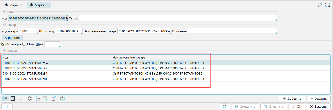 Рис. 7 Агрегированная марка, созданная на ТСД, в справочнике марок