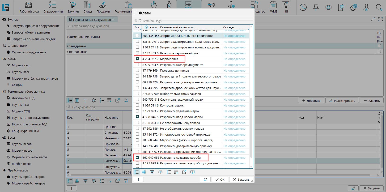 Чтобы создавать короб, для документа ТСД должны быть включены флаги Маркировка и Разрешить создание короба. Остальные флаги в зависимости от конкретного документа и логики работы с ним.