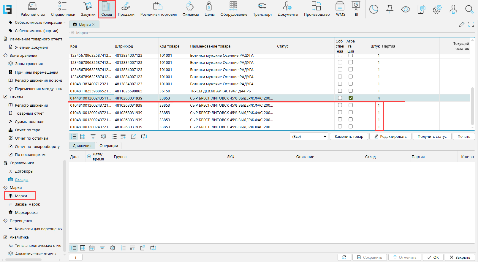 В системе агрегированные марки отображаются как и индивидуальные коды маркировки на форме Склад - Марки - Марки. Для агрегированных марок отмечен признак Агрегация и указано количество индивидуальных марок, которые входят в упаковку (агрегированную марку) (рис. 1). Если открыть форму агрегированной марки, то список вложенных марок отображается в таблице **Марки **(рис.2). Обратите внимание, что индивидуальные марки, входящие в агрегированную, также отображаются в справочнике марок (рис. 1).
