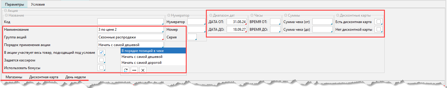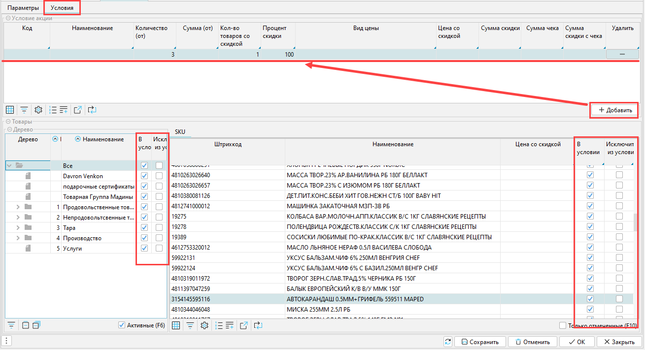 Заполняем поля для формирования условий работы акции. Если внесено несколько строк условий, то акция применяется, когда соблюдены все условия.