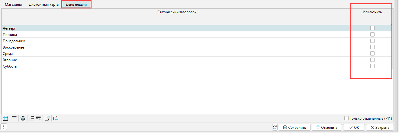 В закладке "День недели" можно исключать дни, в которых акция проводиться не должна