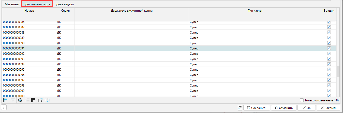 В закладке "Дисконтная карта" отмечаем дисконтные карты, участвующие в акции, если они имеются.