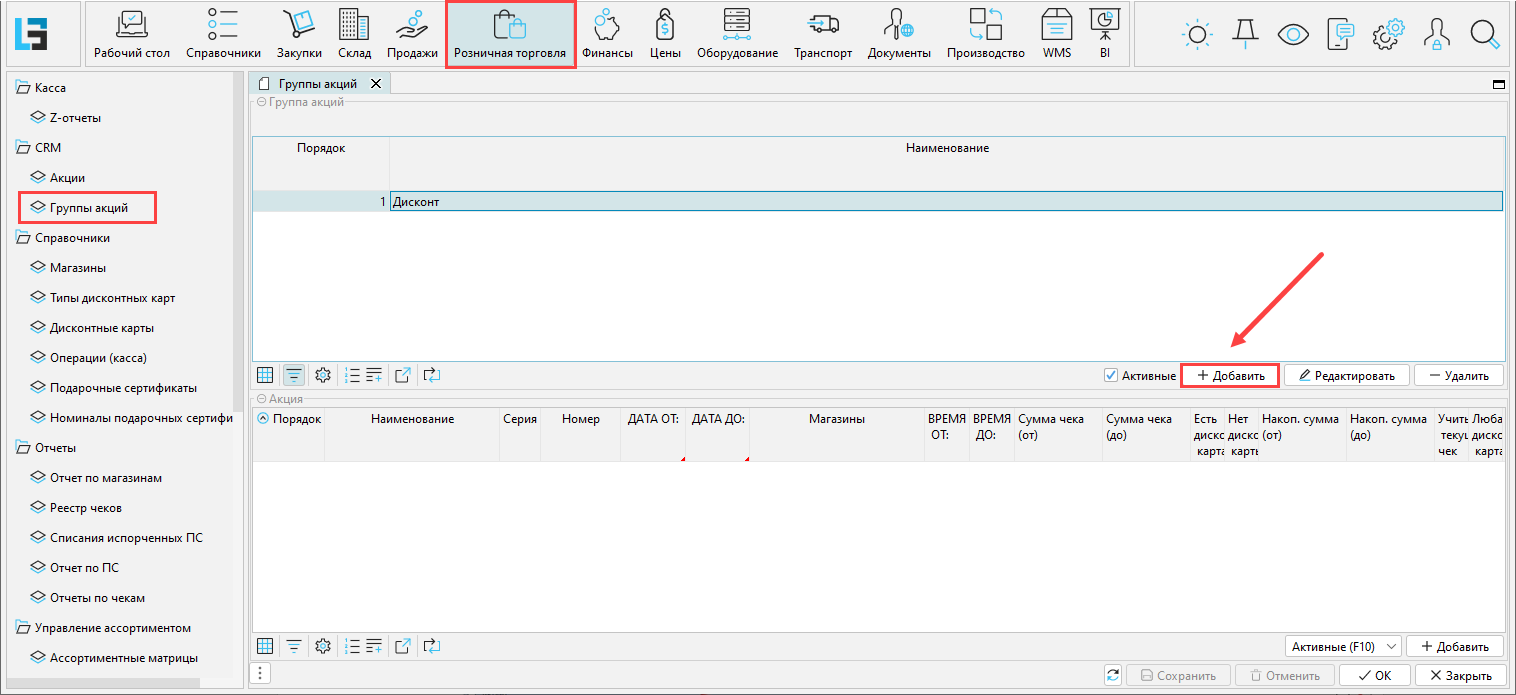 Для создания группы акций заходим на форму "Группы акций" в модуле "Розничная торговля". На открывшейся форме нажимаем кнопочку "Добавить"