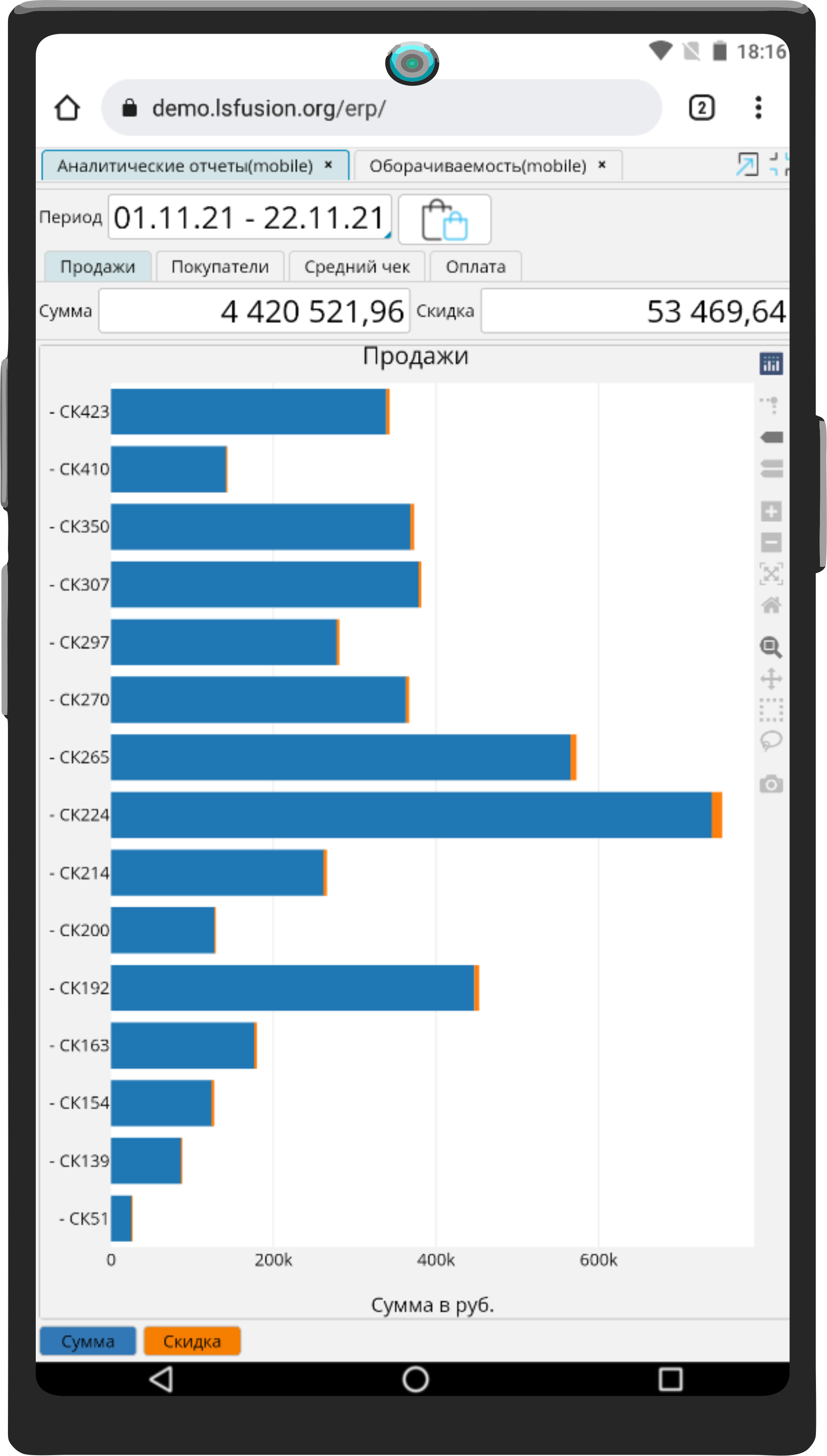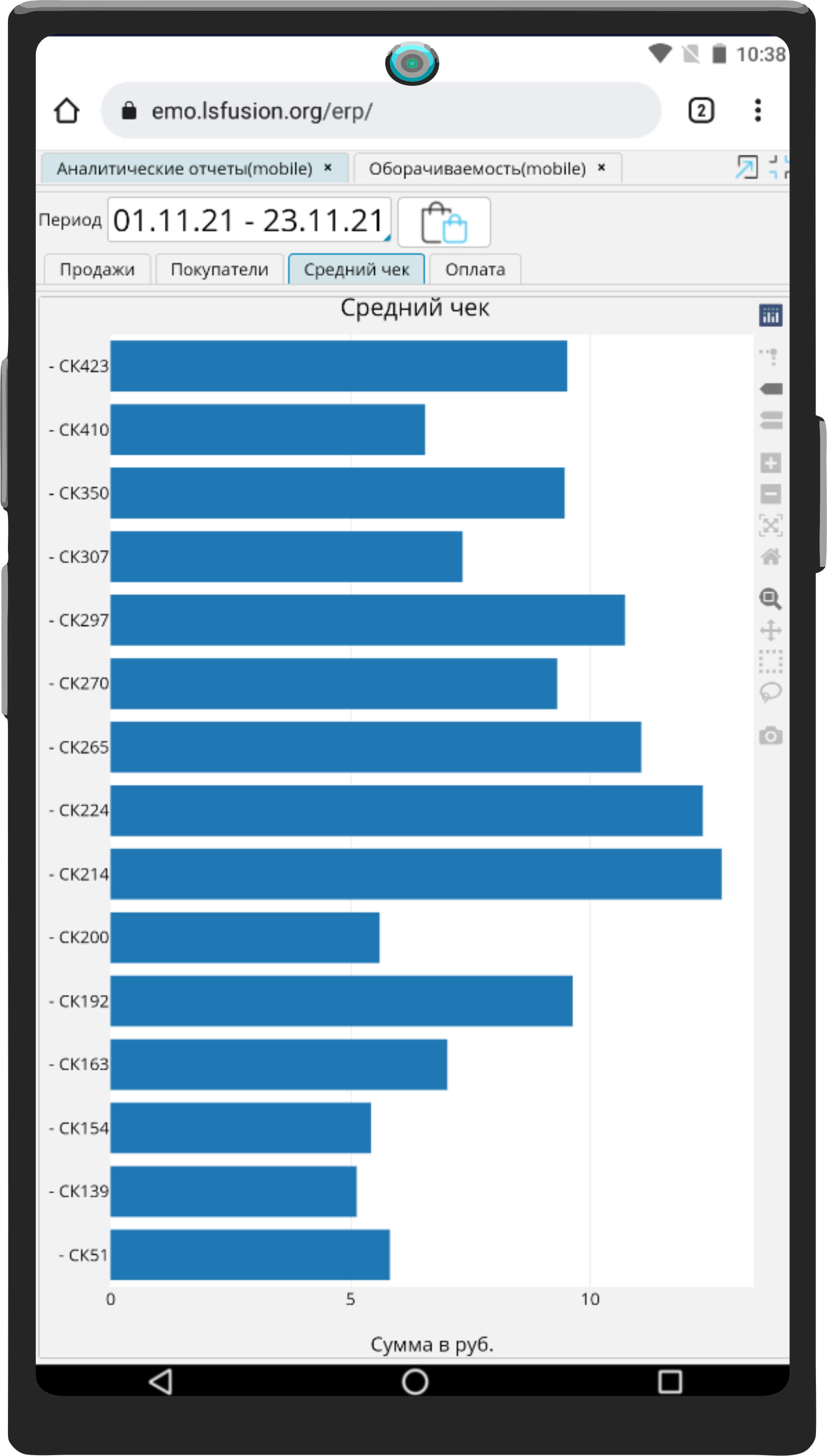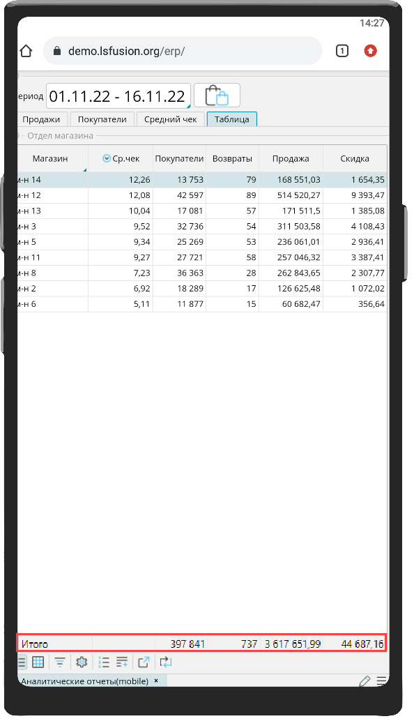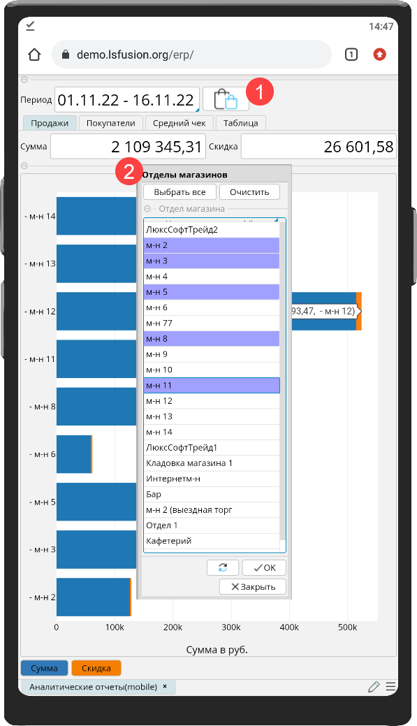 На форме BI – Аналитические отчеты (mobile) представлены отчеты по розничным продажам в разрезе отделов магазинов.