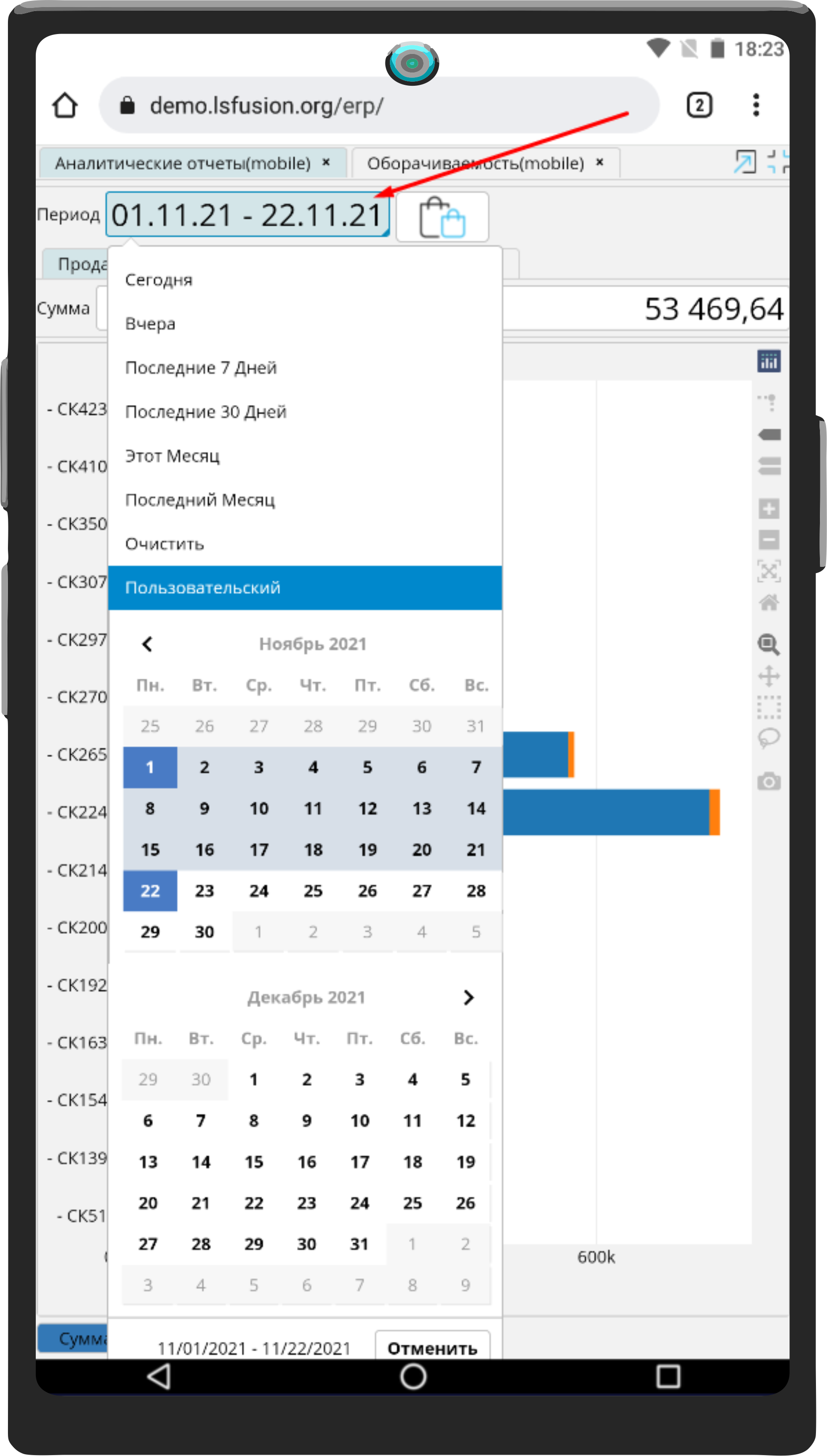 Чтобы установить период, за который необходимо составить отчет, необходимо кликнуть в поле Период и выбрать один из предопределенных периодов, или установить даты начала и окончания периода для отчета.