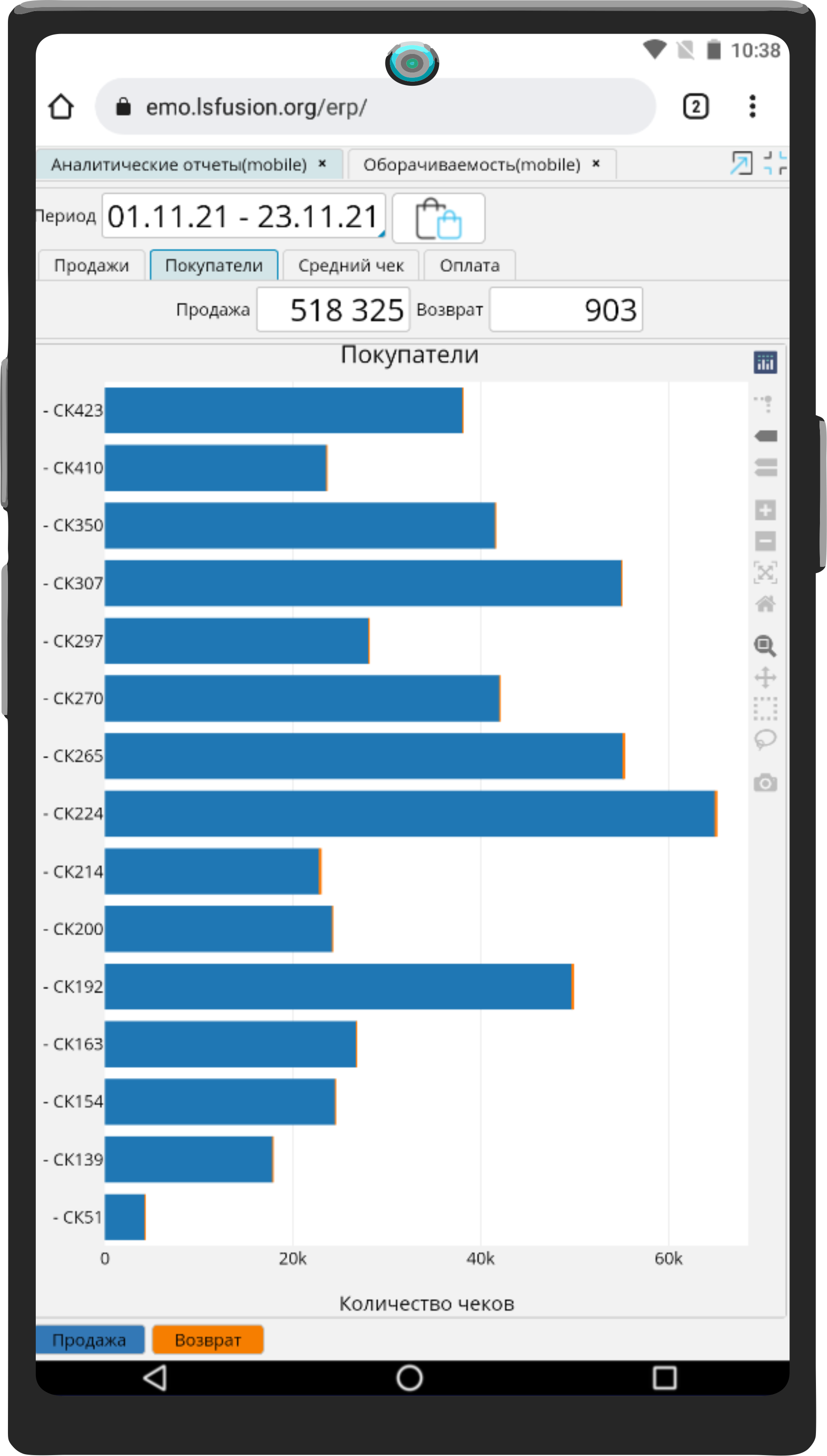 На вкладке Покупатели представлена информация по количеству чеков продажи и возврата по магазинам.