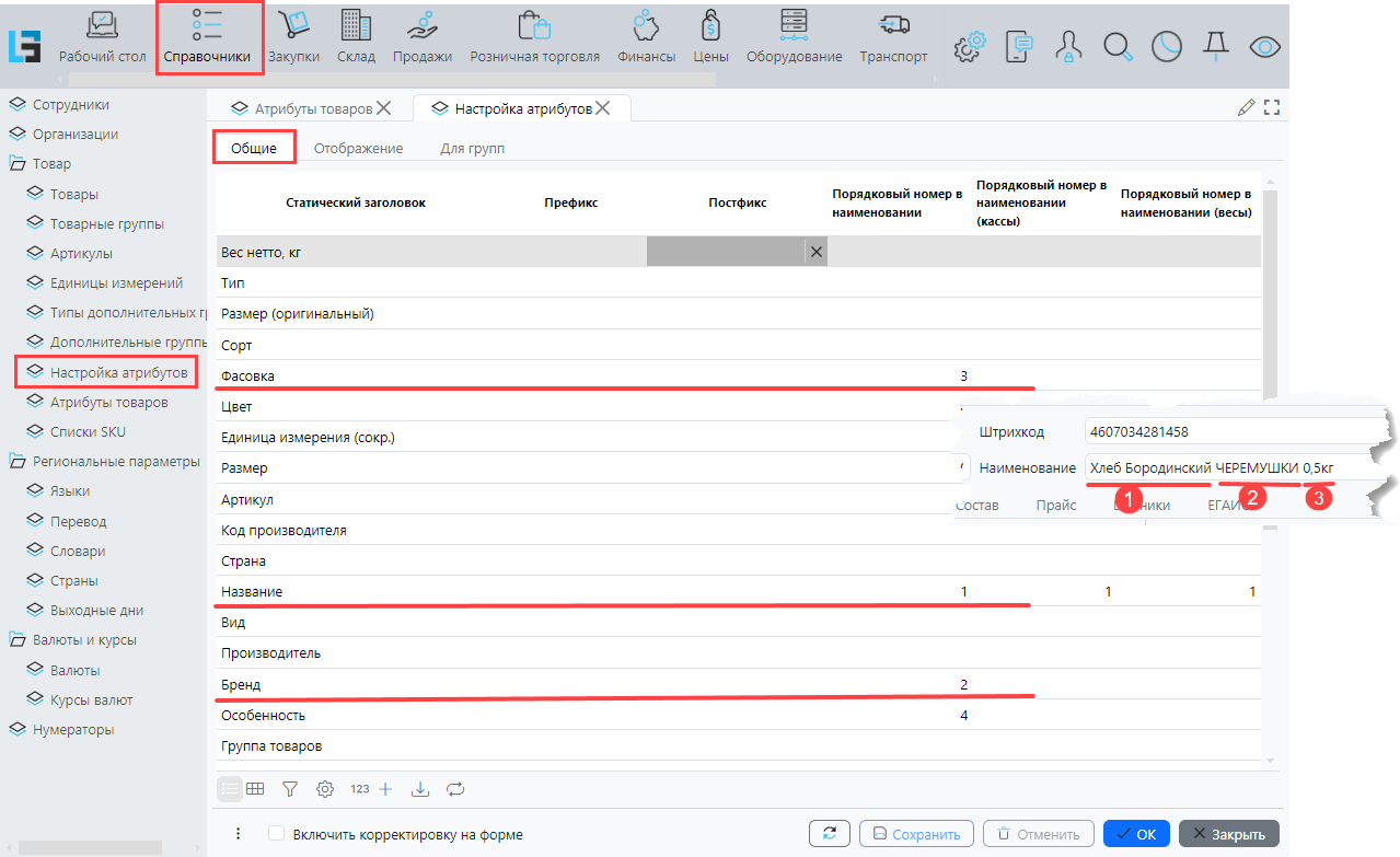 На вкладке Общие указываются атрибуты, которые будут использоваться для формирования трех типов имени: Наименование (обычное)**,Наименование для касс **и Наименование для весов. Очередность следования атрибута задается порядковым номером. Для задействованных атрибутов также можно использовать префикс и постфикс.