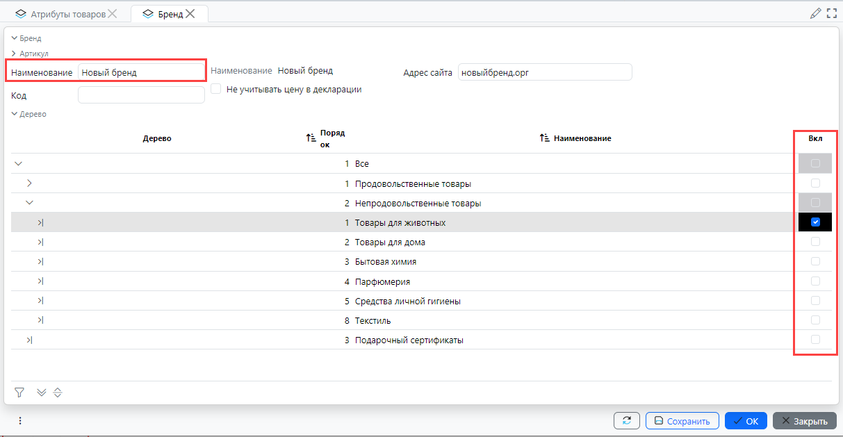 На вкладке Для групп можно задать атрибуты, которые обязательны для заполнения для товаров определенной группы. Для этого необходимо выделить товарную группу и поставить галочку Обязательный для заполнения для атрибута.