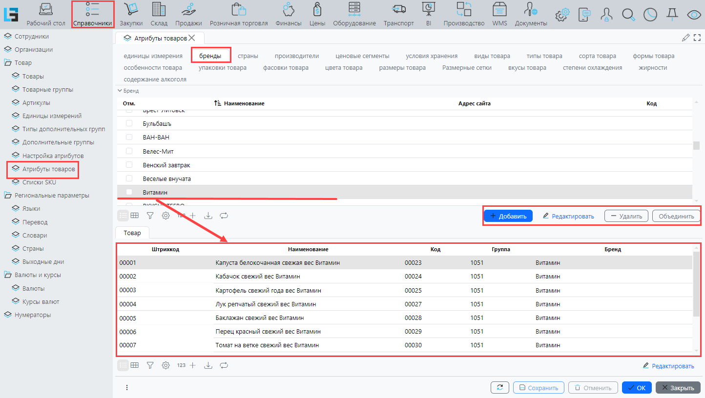 На форме Справочники - Атрибуты отображены доступные атрибуты товаров и их значения. Каждому атрибуту товара соответствует вкладка, на которой представлен список значений атрибута. Пользователь может добавить новые значения атрибута, редактировать или удалять существующие с помощью соответствующих кнопок. На вкладке Товар отображаются товары, для которых задано выделенное курсором значение атрибута.