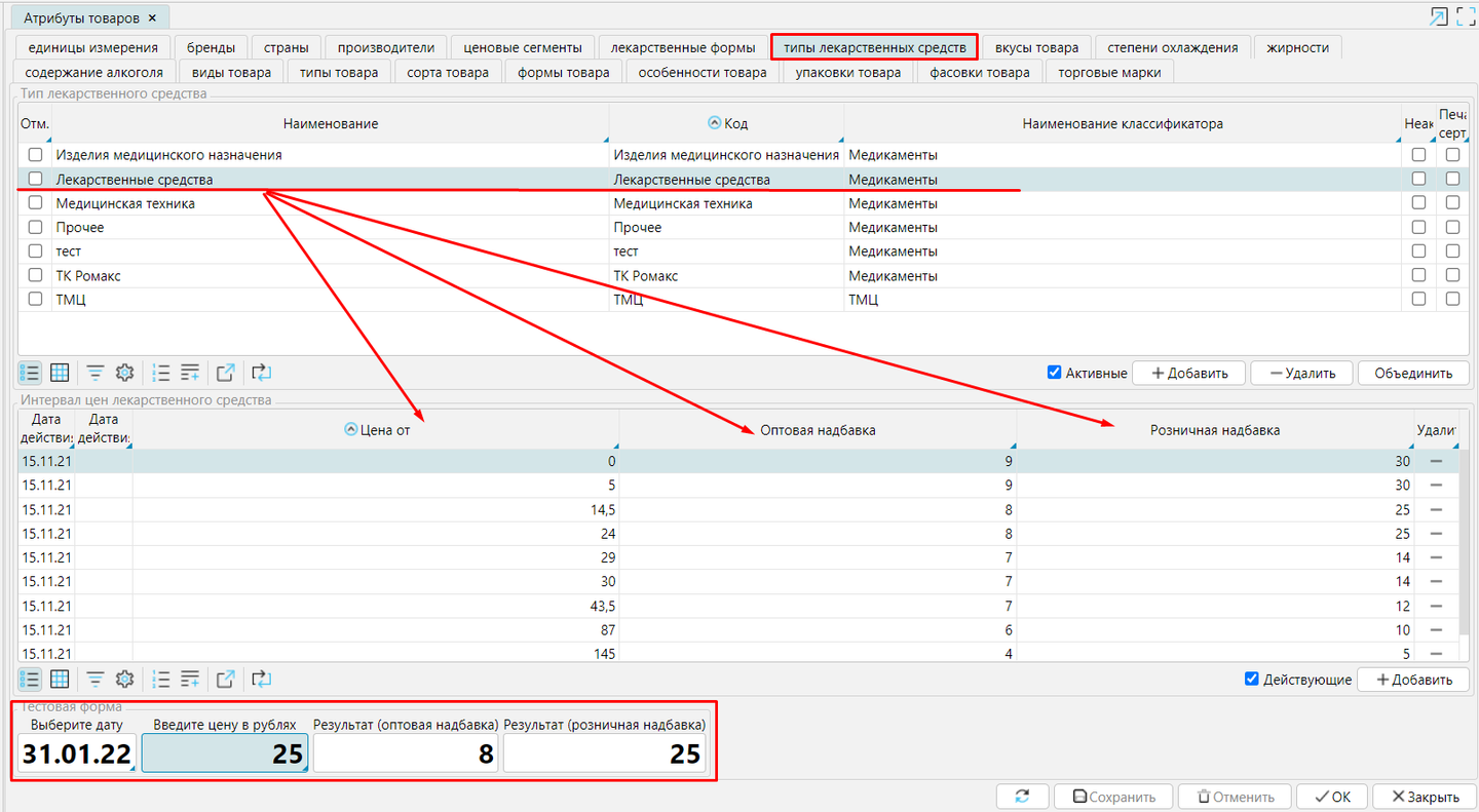 Внизу формы находится тестовая форма. Выделите тип лекарственного средства в верхней таблице, введите в тестовой форме дату и цену лекарственного средства, нажмите Enter и программа отобразит максимальную оптовую и розничную надбавку в процентах.