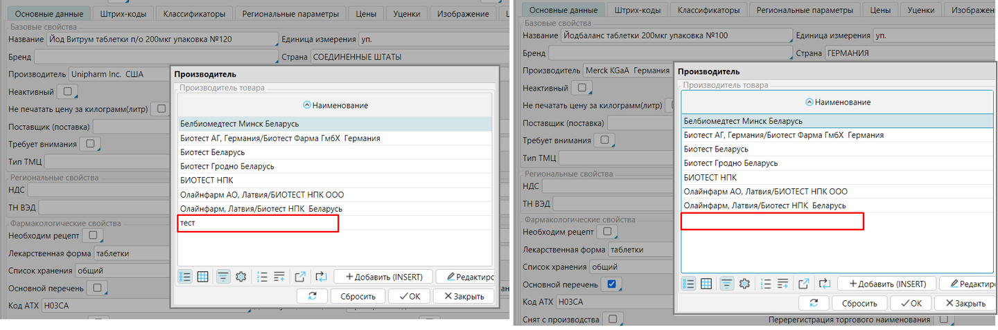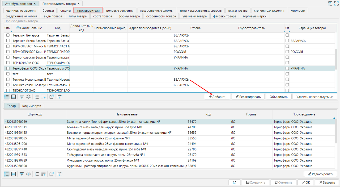 Количество производителей товаров, которые участвуют в торговле велико. Их вносят в справочник значений атрибута на вкладке производители.