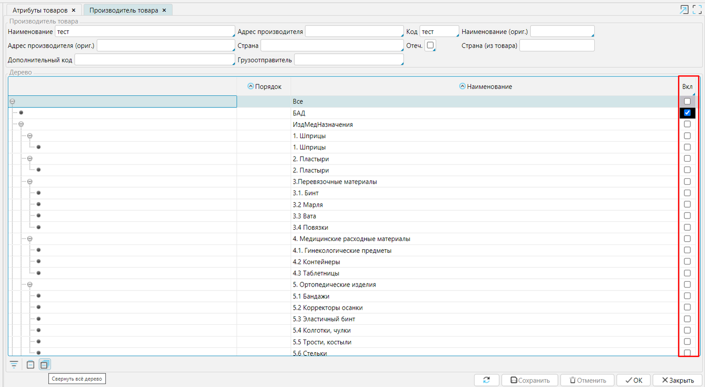 В карточке производителя заполняют информацию о нем, и можно отметить, для каких групп товаров будет использоваться данное значение. Если для производителя отмечены группы товаров, то выбор данного производителя будет доступен только для товаров отмеченных групп (рис. 4).