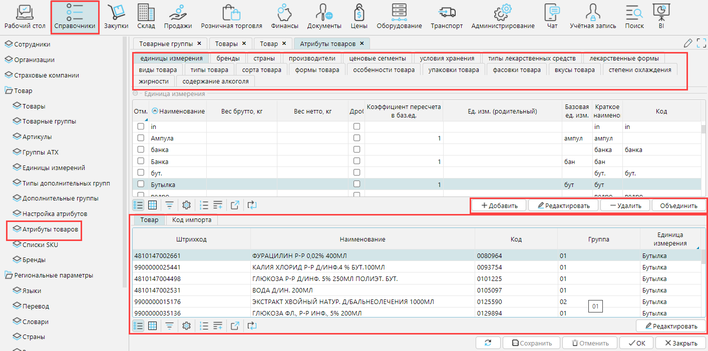 Ряд атрибутов имеют ограниченное число значений, которые назначаются товарам. Например, единицы измерения, типы, виды, сорта товара, ценовые сегменты и т.п. Такие атрибуты настраиваются на форме Справочники - Товары - Атрибуты товаров. Для каждого настраиваемого атрибута предусмотрена отдельная вкладка, на которой можно создавать и редактировать значения кнопками Добавить, Редактировать, Удалить, Объединить. В нижнем блоке отображаются товары, для которых установлено выделенное курсором в верхнем блоке значение атрибута. Ниже приведены настройки и примеры использование некоторых атрибутов.