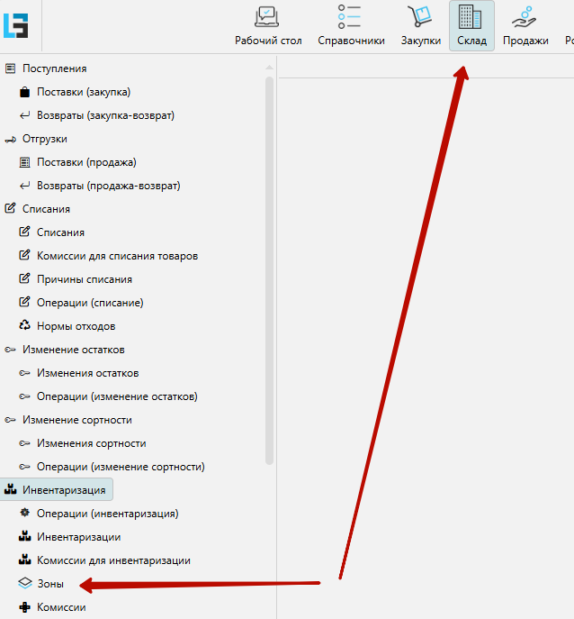 Заходим на форму Склад/Инвентаризация/ Зоны
