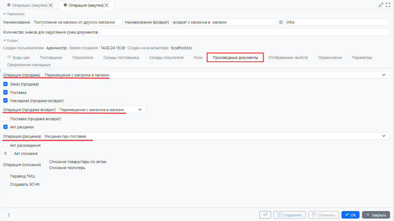 Формирование производных документов настраивается в операциях. В зависимости от логики бизнес-процесса на вкладке Производные документы. Важно помнить, что обязательно нужно настроить и указать операции для производных документов.