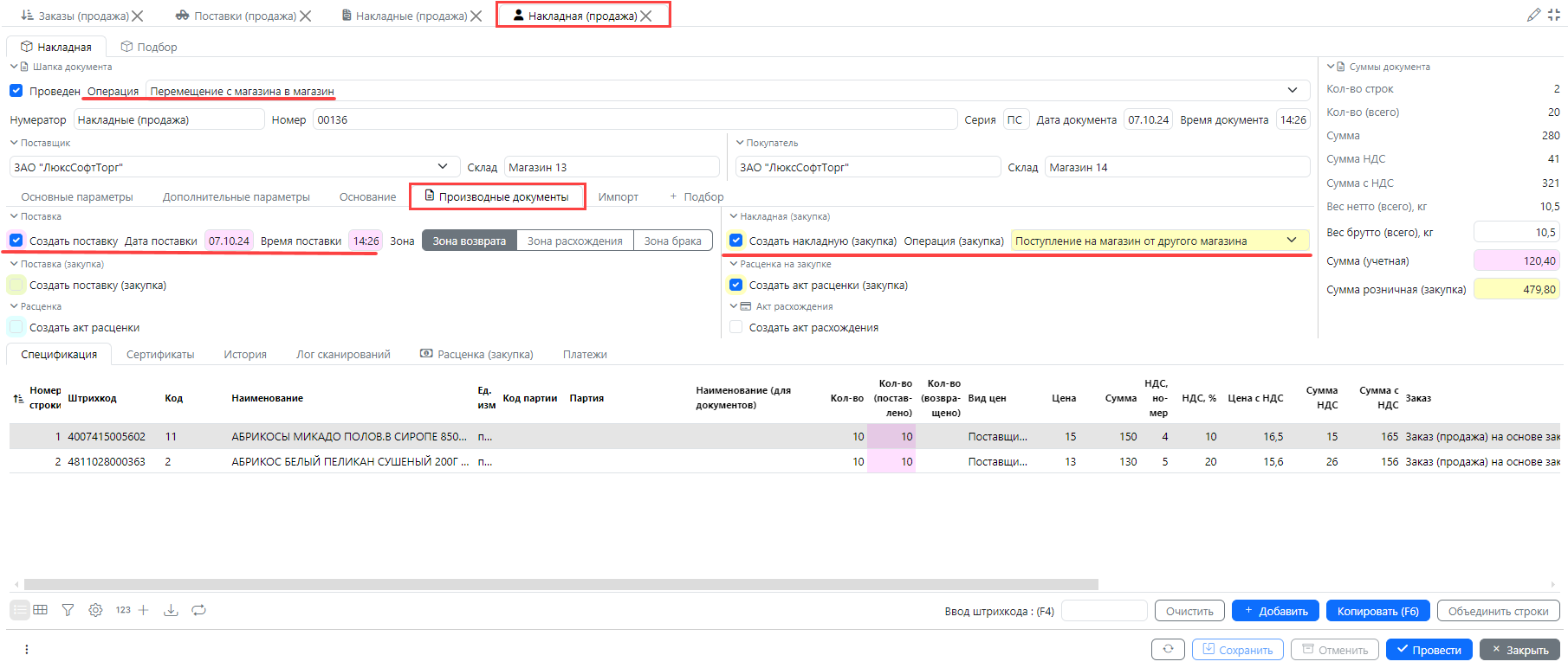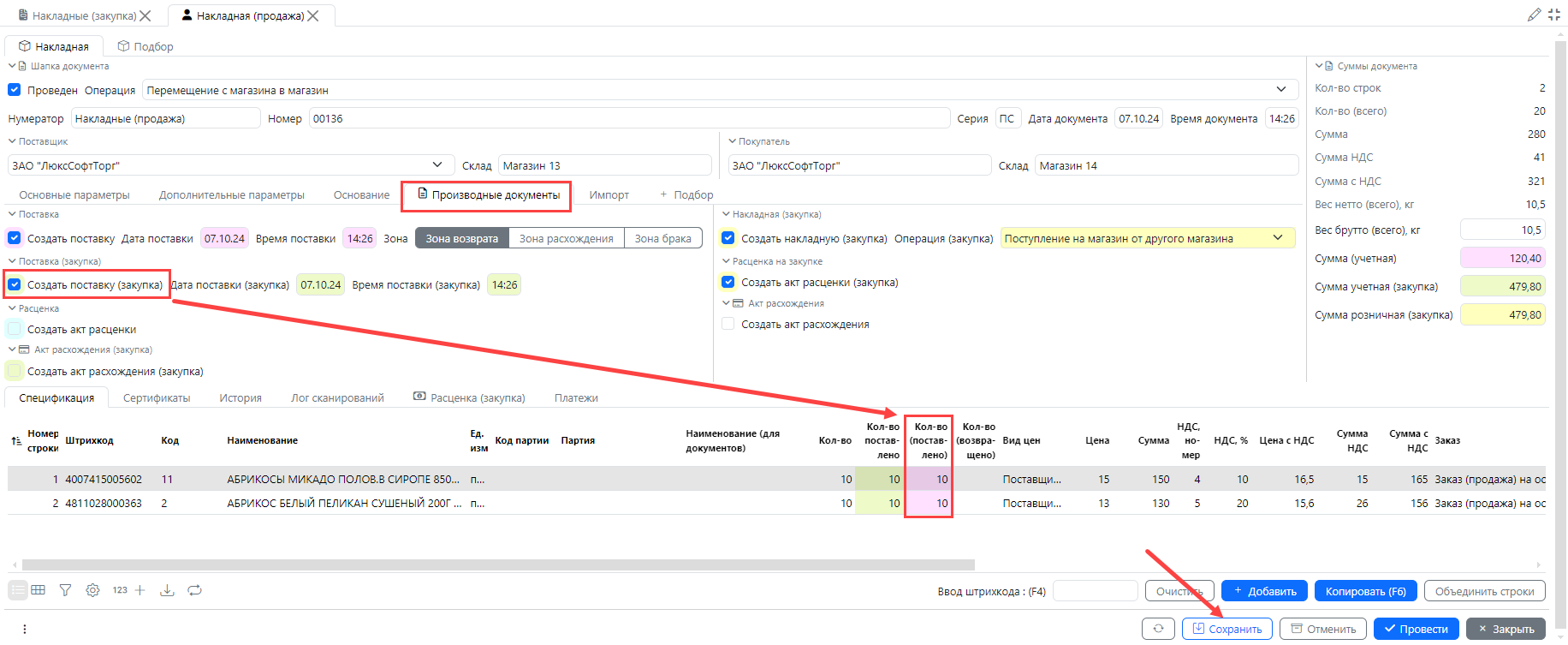 4. Накладная продажа, созданная Магазином 13 будет одновременно выступать накладной закупки для Магазина 14 и будет отображаться на форме Закупки - Накладные. При поступлении товара в Магазине 14 сотруднику не нужно создавать накладную, необходимо отфильтровать на форме Закупки - **Накладные **не оприходованные накладные и открыть нужную накладную на редактирование. Чтобы оприходовать полученный товар, нужно на вкладке Производные документы отметить признак Создать поставку (закупка), заполнится поставленное количество. Его нужно проверить и сохранить накладную. Будет создана поставка (закупка) и товар станет на приход на складе.