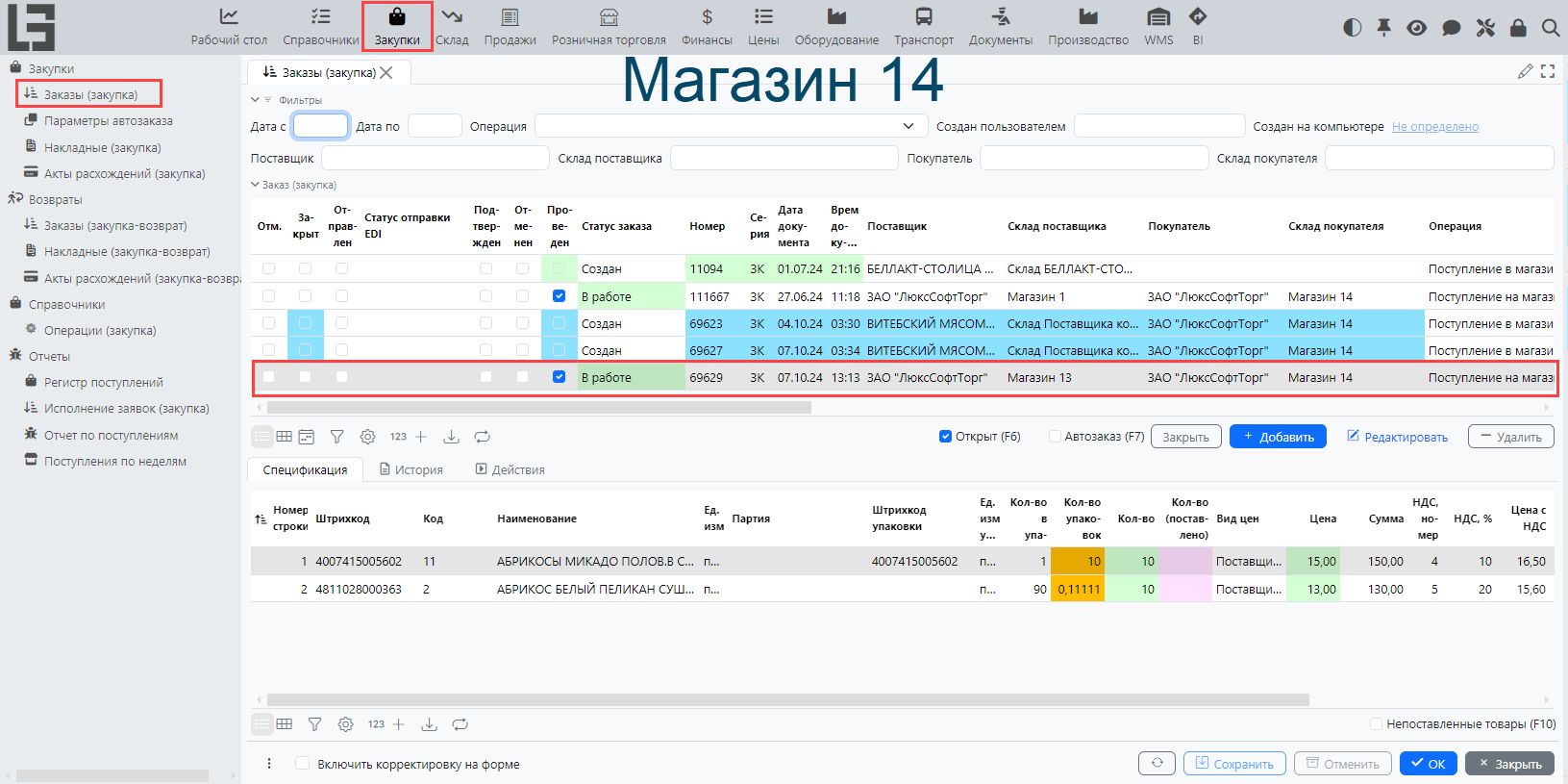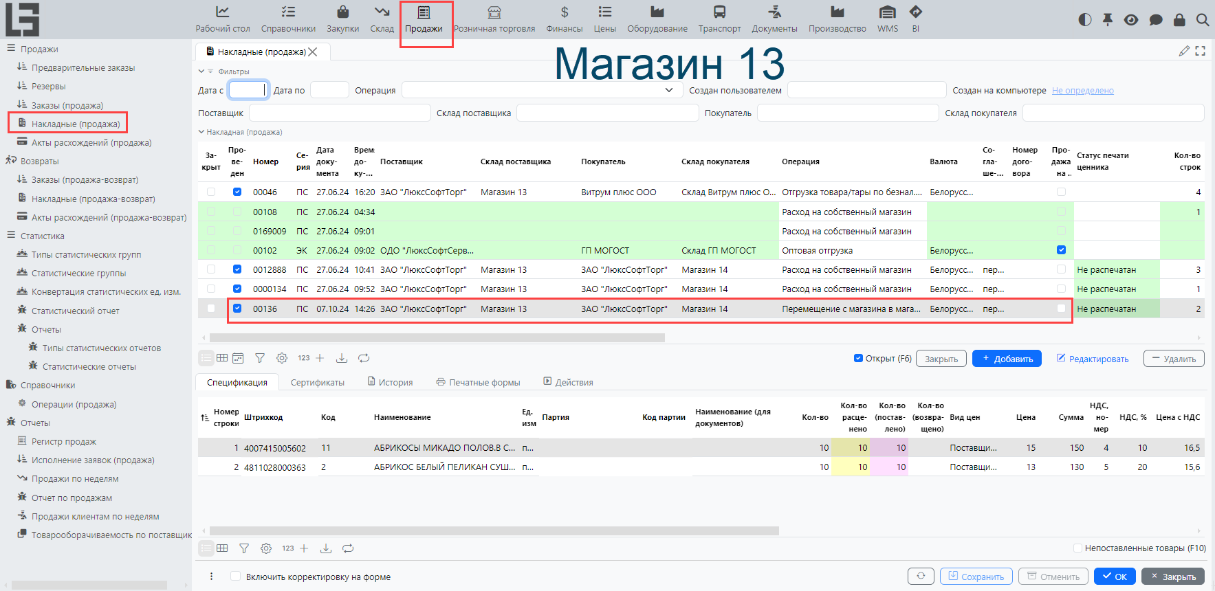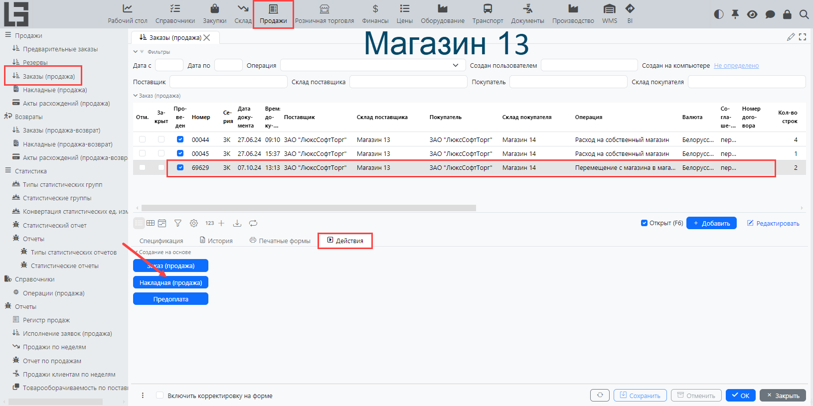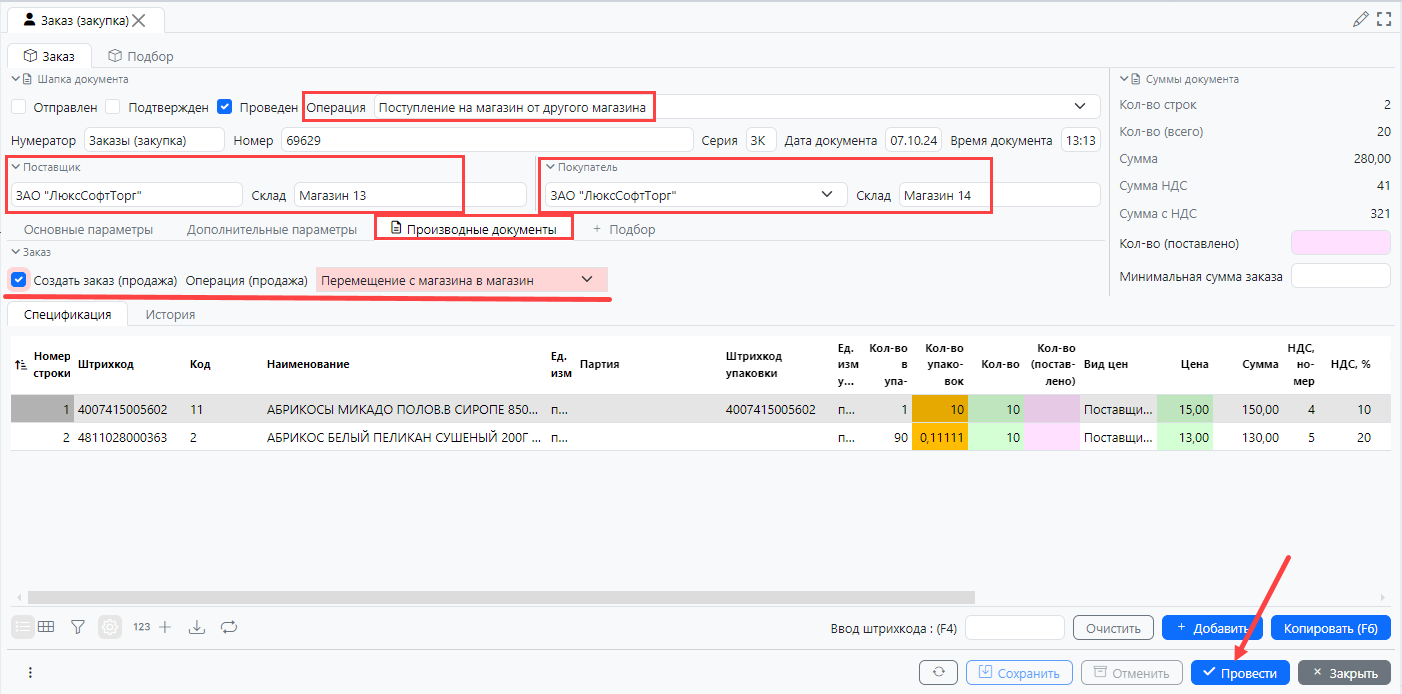 Для примера сделаем перемещение товаров с Магазина 13 (поставщик) на Магазин 14 (покупатель).