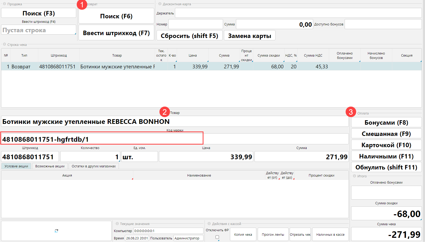 - если при продаже товара фиксировалась марка, то она подтянется в чек возврата