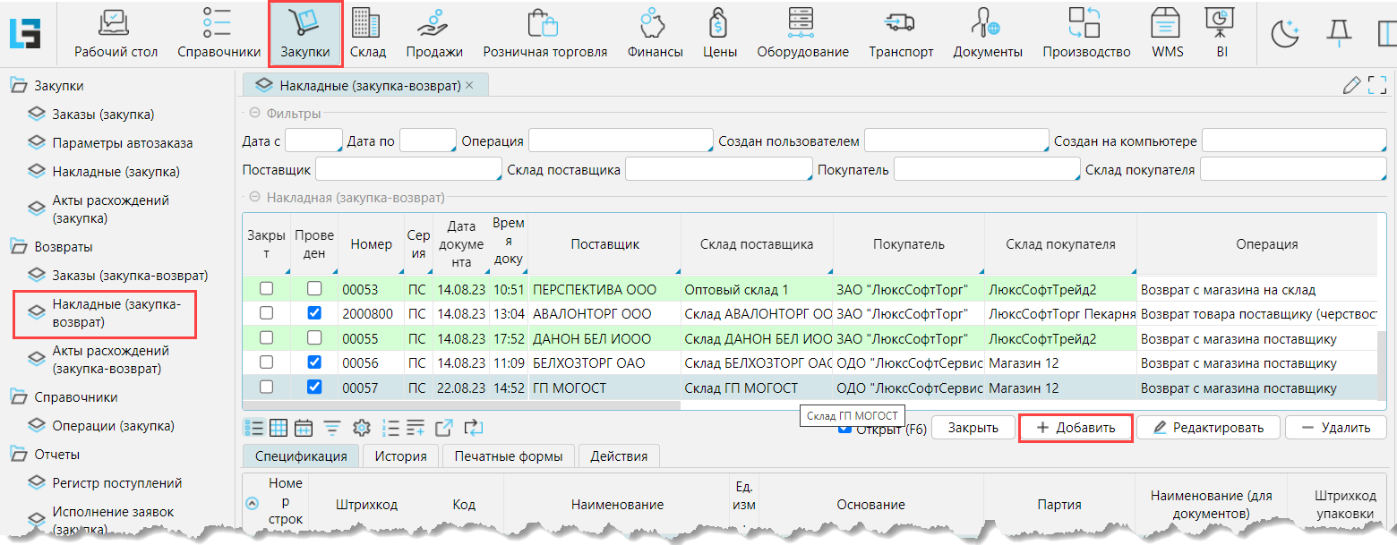 выбрать поставщика и его склад - это склад или магазин откуда продали возвращаемый товар