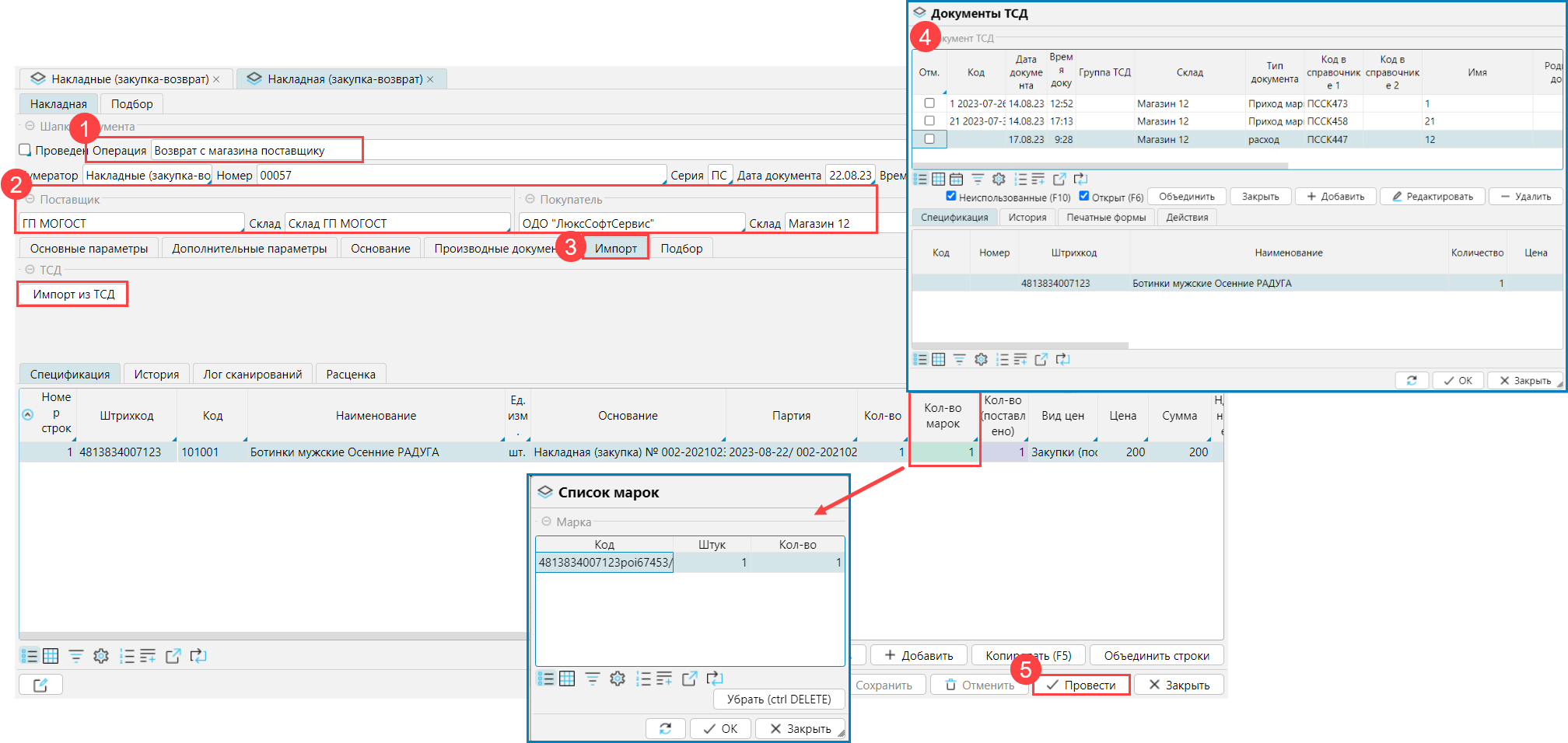 Документы возврата маркированного товара работают аналогично документам прихода и расхода.