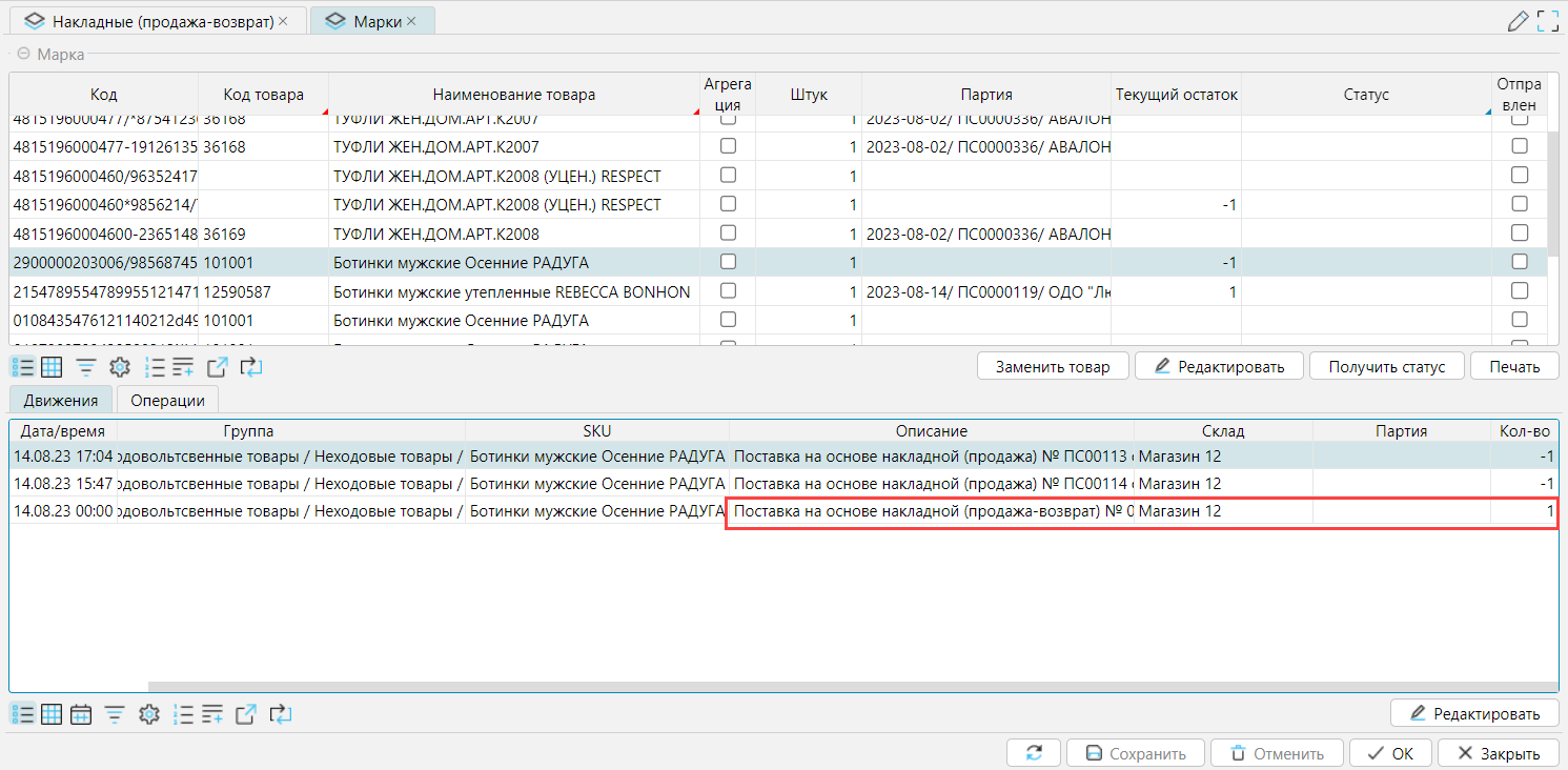 В справочнике марок на вкладке Движения отобразится постановка марок по возвращенному товару на учет.