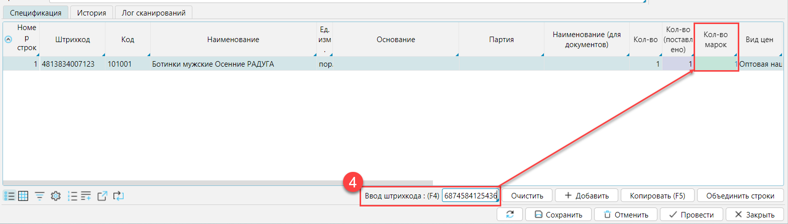 Марки можно добавить вручную через поле **Ввод штрихкода **