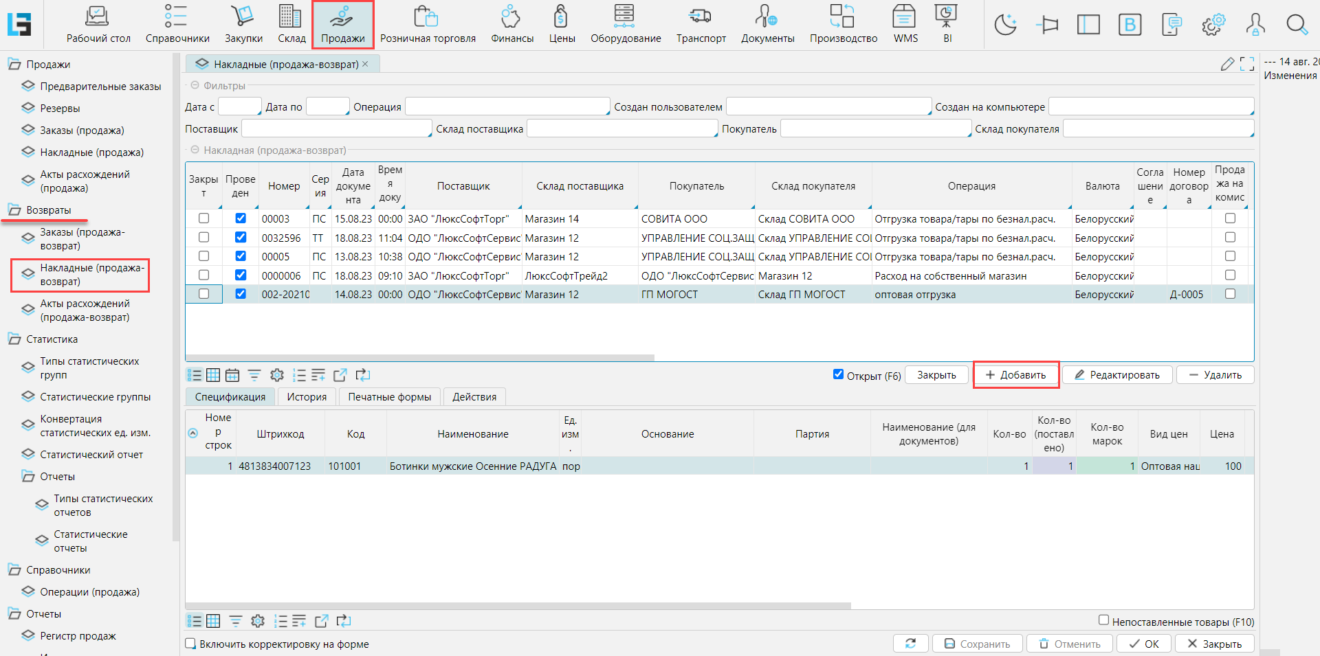 Получение товара, который нам возвращает покупатель, проходит по такому же алгоритму, как и приемка маркированного товара, но на форме Продажи - Возвраты - Накладные (продажа-возврат)