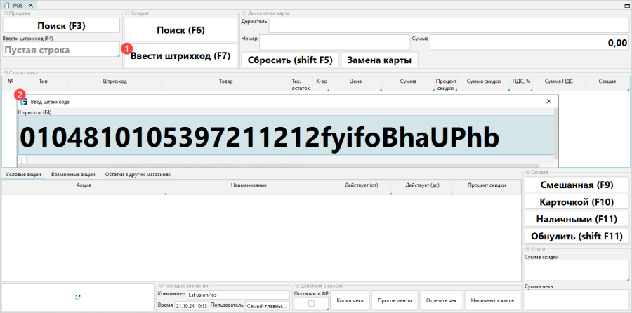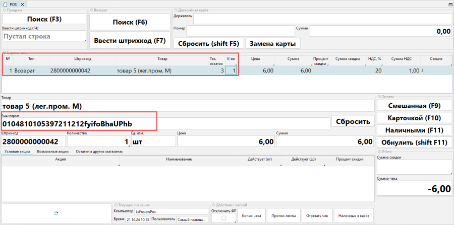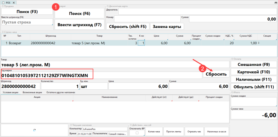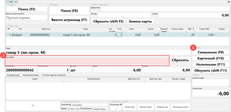 - Нажать Ввести штрихкод в блоке Возврат или клавишу F7