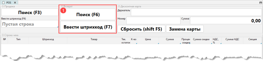 Для возврата нужно найти строку чека с купленным товаром. Поиск можно проводить по штрихкоду либо по чекам.