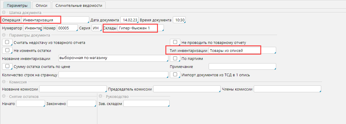Для проведения инвентаризации по произвольному списку товаров, необходимо создать документ инвентаризации и заполнить следующие параметры: