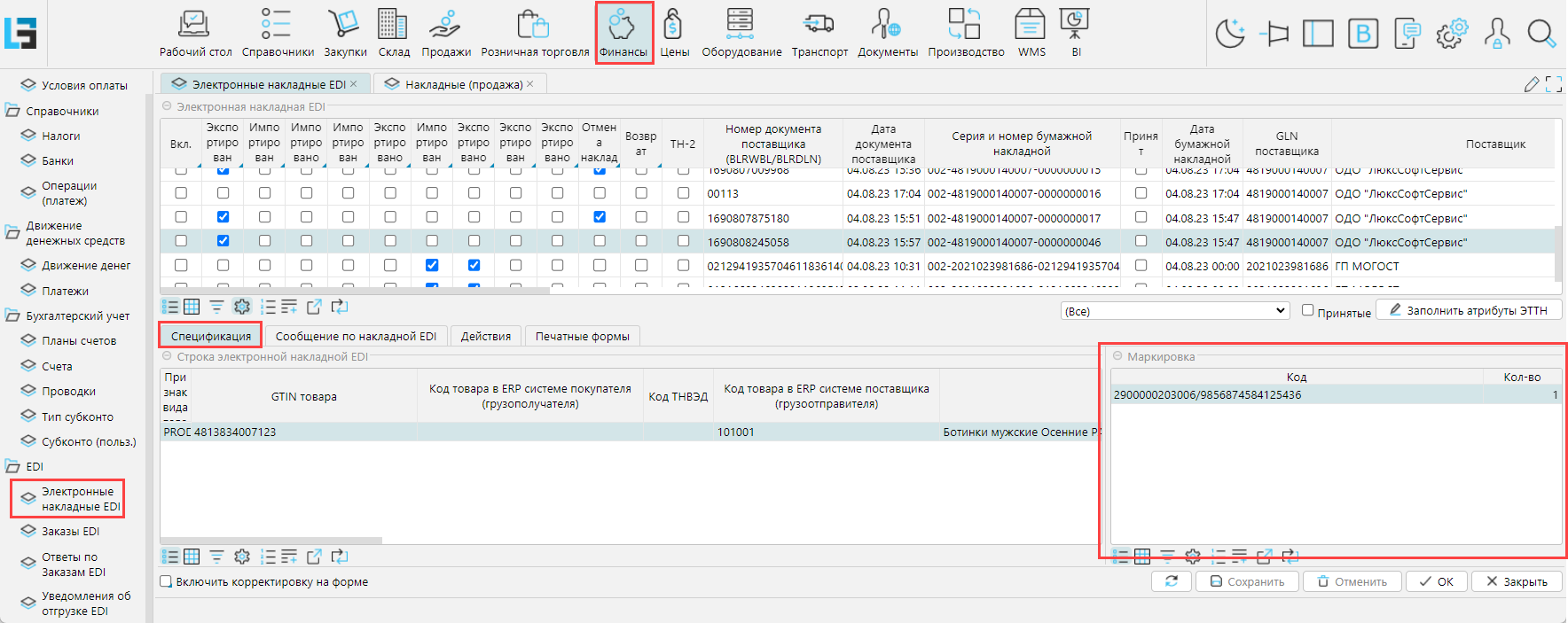 4. Просмотреть коды маркировки в ЭН можно на форме Электронные накладные на вкладке Спецификация в таблице Маркировка.