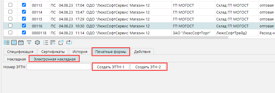 2. на форме Продажи - Накладные выделите накладную и на вкладке Печатные формы - Электронная накладная нажмите Создать ЭТТН-1 или Создать ЭТН-2, в зависимости от того, какой тип  электронной накладной нужен