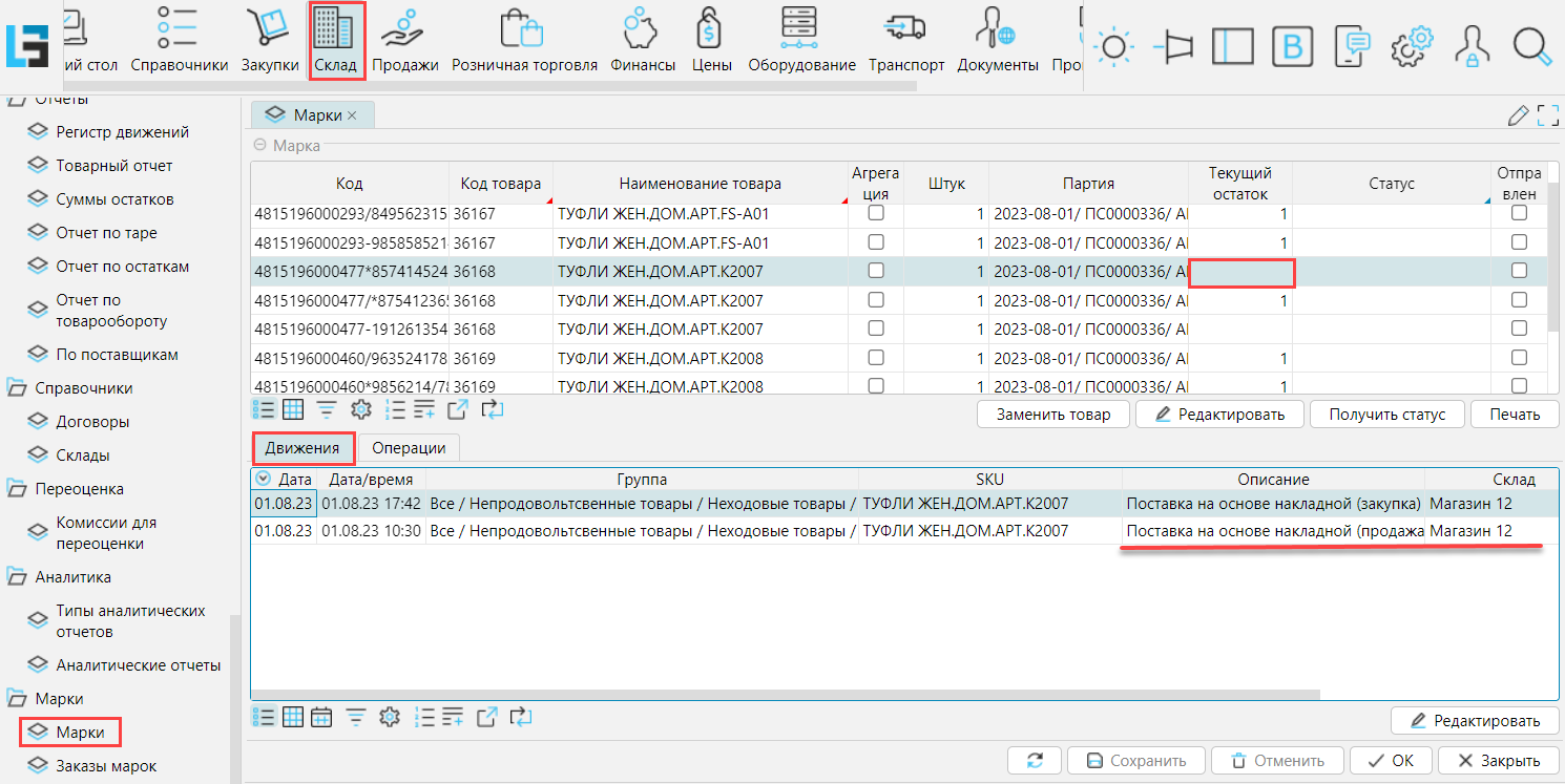 На форме Склад - Марки на вкладке Движения отображается движение маркированного товара.