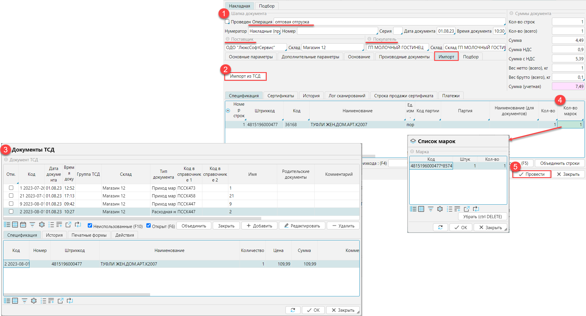 1. Создайте расходную накладную и импортируйте в нее коды маркировки товаров