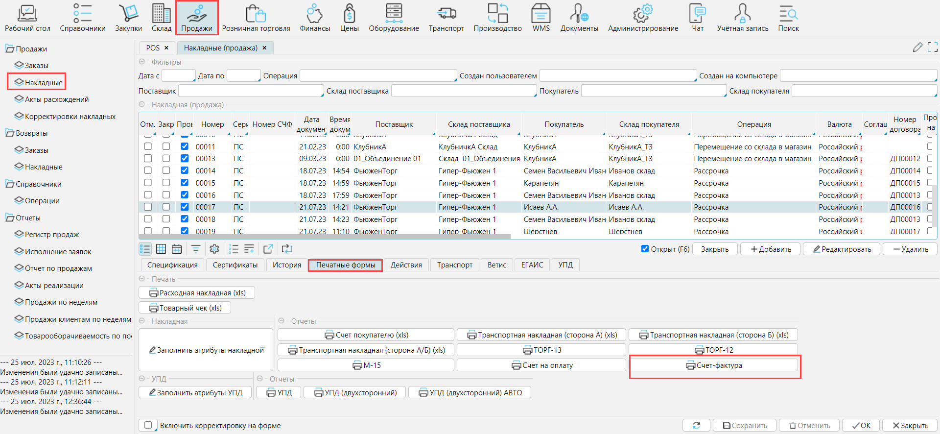 Система создаст накладную, договор и платеж (если покупатель новый, то покупателя и его склад) по указанным данным. На форме Продажи - Накладные - Печатные формы доступна печать счета-фактуры и других необходимых документов.