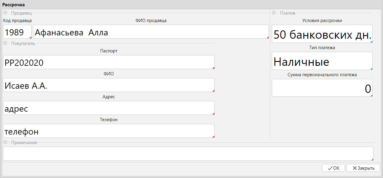 Заполняет форму рассрочки. Необходимо указать ниже описанные данные и нажать ОК:
