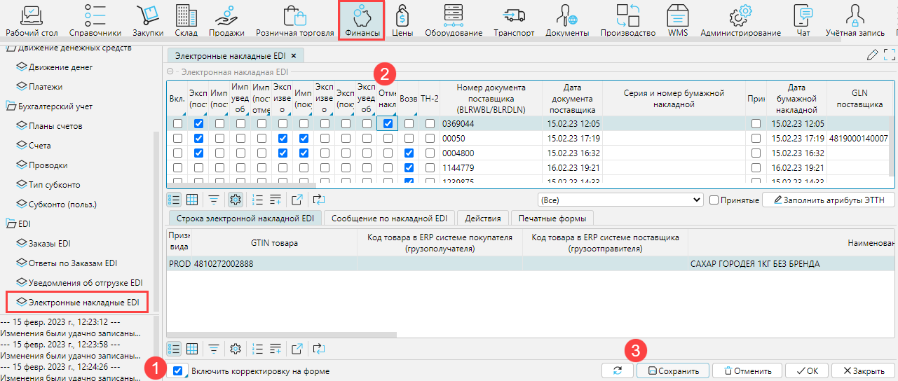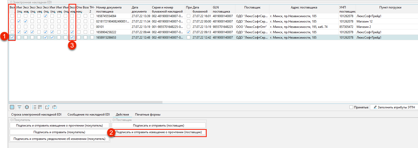 3. После получения подтвержденной накладной от покупателя, вы должны отправить извещение о получении накладной. На форме Финансы - EDI - Электронные накладные EDI нужно выделить накладную (1) и нажать Подписать и отправить извещение о прочтении(поставщик) (2). В строке накладной появится галочка Экспортировано извещение о прочтении (поставщик) (3).