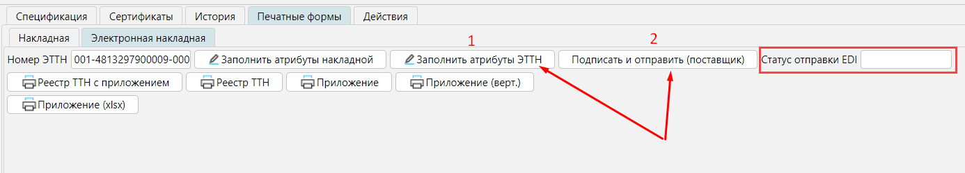 Для отправки электронной накладной нужно нажать Подписать и отправить (поставщик). Электронная накладная будет подписана вашей ЭЦП и направлена покупателю. В поле Статус отправки EDI будут отображаться сообщения об ошибках при отправке, если такие были или код /сообщения об успешном выполнении этапов работы с электронной накладной.