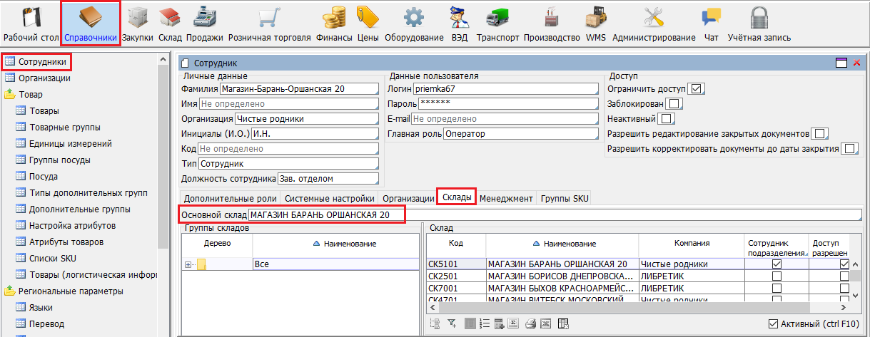В ON-LINE режиме доступ к Складу определяется правами Сотрудника, авторизовавшегося на ТСД. Ему будут доступны документы и остатки склада, который указан в поле «Основной склад» на вкладке «Склады» (рис.6).