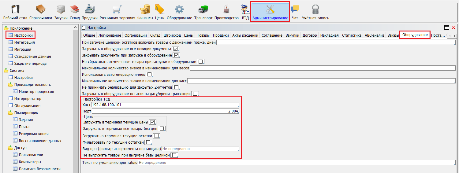Основные настрой для ON-LINE режим производятся на форме Администрирование\Настройки\вкладка Оборудование\блок Настройки ТСД (рис.5).