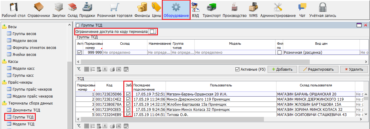 4) При работе с ТСД в ON-LINE режиме, на форме Оборудование\Терминалы сбора данных\Группы ТСД группа может не вноситься. Если же группа внесена, то появляется возможность отслеживать последние подключения терминалов к БД. Здесь же можно ограничить доступ к БД отдельных терминалов, путем использования отметок «Заблокирован» напротив нужного ТСД. Эта отметка работает, если включена отметка «Ограничить доступ по коду терминала» (рис.4).