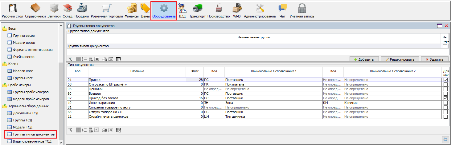 2) На форме Оборудование\Терминалы сбора данных\Группы типов документов указываются все типы документов (операций), применяемые на ТСД – Приход, Отгрузка по б/н расчету, Инвентаризация и др. (рис.2.).