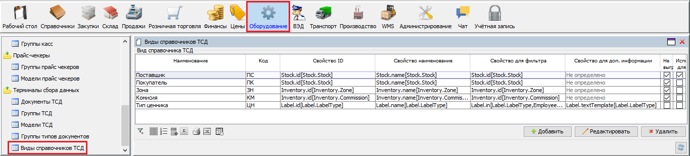 1) На форме Оборудование\Терминалы сбора данных\Виды справочников ТСД указываются справочники, которые будут использоваться на ТСД, например, Поставщики, Покупатели и др. (рис.1.). Например, без настройки справочника поставщиков в ТСД не загрузятся заказы, без справочника складов нельзя будет выбрать склад, для работы с ТСД и т.д. Для каждого справочника заполняются следующие поля: