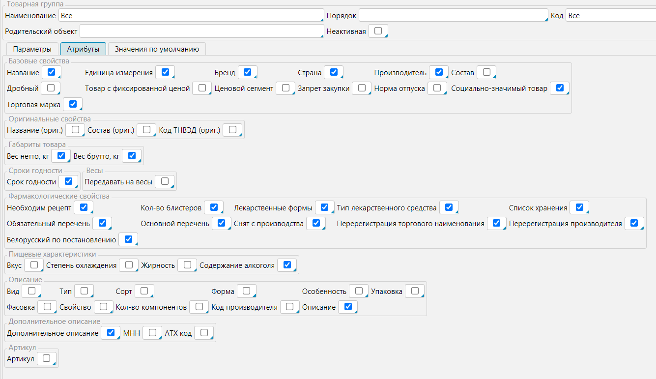 На вкладке Атрибуты указаны свойства товаров. Те свойства, которые отмечены галочкой будут отображаться для товаров данной группы и ее подгрупп.