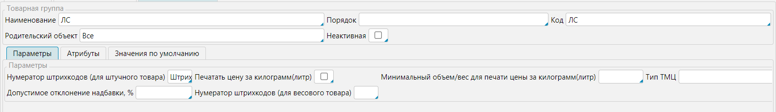 На вкладке Параметры задаются значения, которые применяются к товарам группы