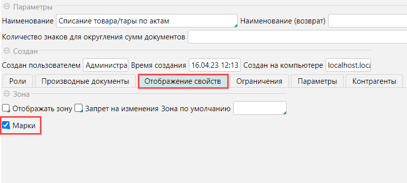 2. В настройках операций, в которых необходимо прослеживание марок,  на вкладке Отображение свойств отметить признак Марки, это позволить просматривать коды маркировки в документе.