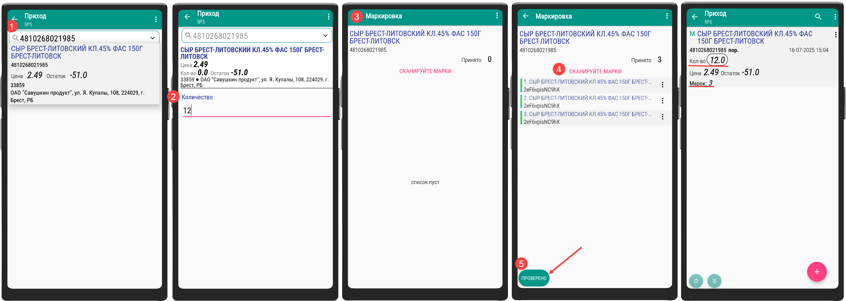 - Сканируйте марки на товарах до тех пор, пока количество марок не появится кнопка Проверено, это значит, что число отсканированных марок достигло установленного процента доверительной приемки.
