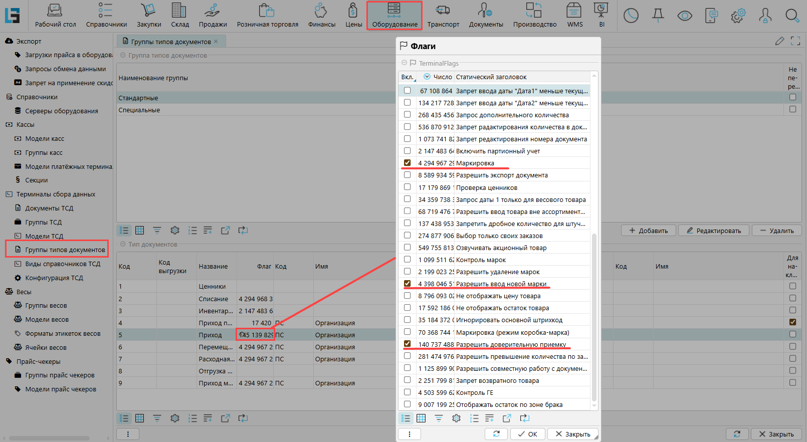 Рис. 3 Настройка флагов типа документа ТСД